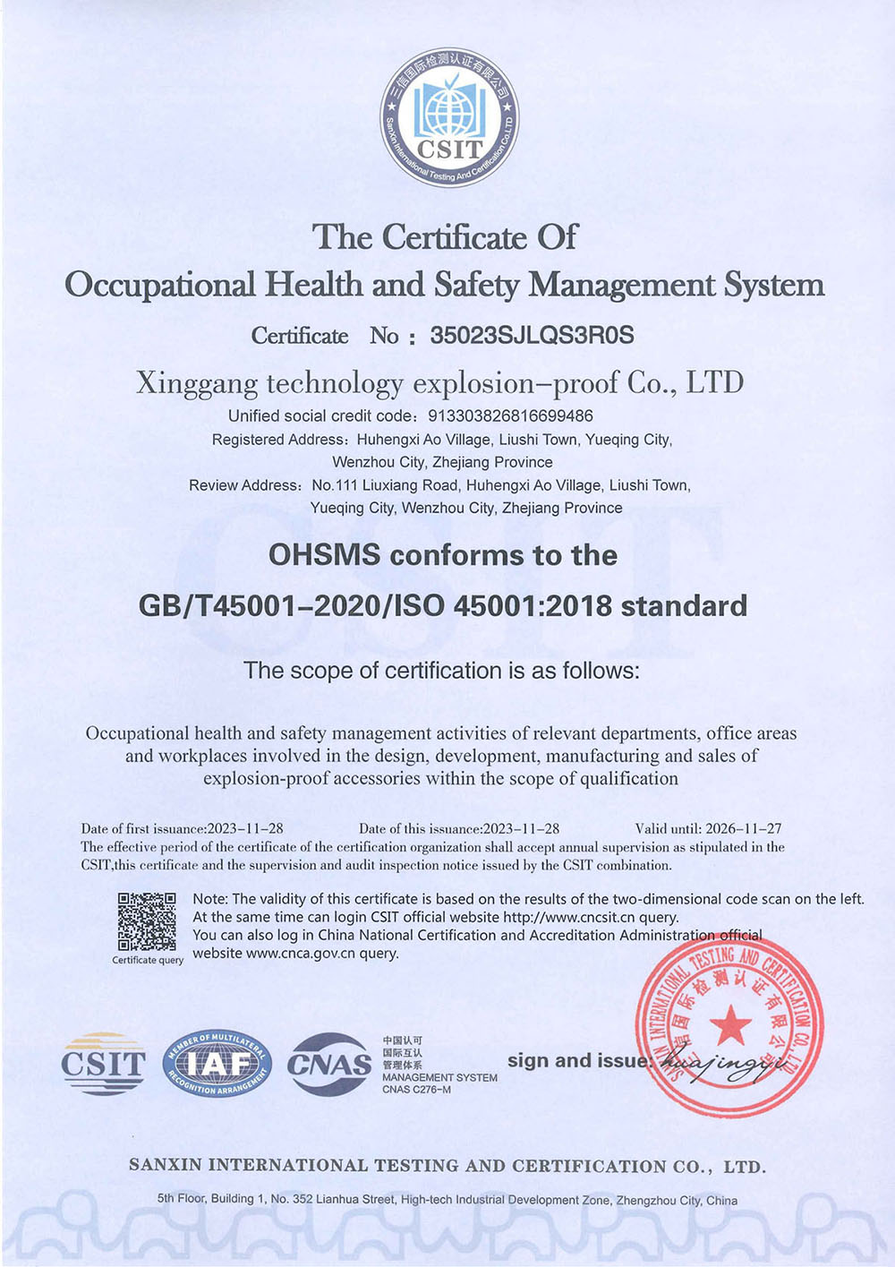 The Certificate Of Occupational Health and Safety Management System